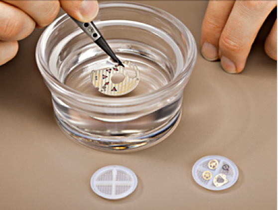 拆解腕錶的錶殼,然後把所有零件以專用液體徹底去油和清洗。